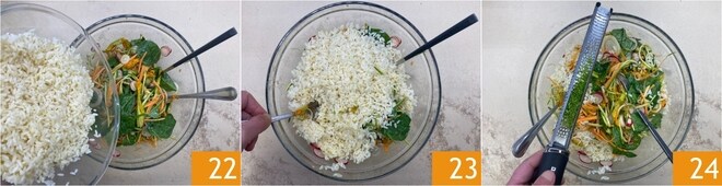 Den Reis hinzufügen 22 und erneut mischen 23, anschließend mit geriebener Limettenschale aromatisieren 24.