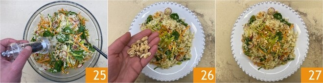 Schließlich mit einer Prise Pfeffer 25 und den gerösteten Erdnüssen 26 abschließen. Ein letztes Mal mischen und Ihr Reissalat mit Gemüse und Erdnüssen ist bereit zum Genießen 27!