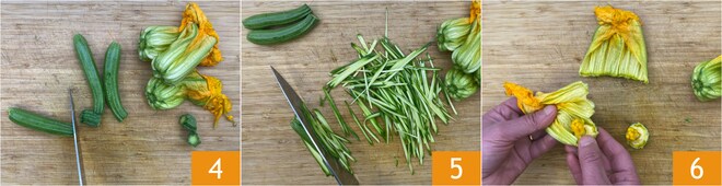 Die Blüten von den Zucchini entfernen und die Enden abschneiden 4, dann ebenfalls in Julienne schneiden 5. Die Blüten vorsichtig öffnen und den inneren Stiel entfernen 6.