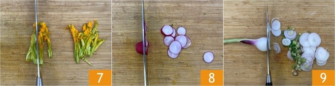 Auch die Blüten in Streifen schneiden 7. Die Radieschen 8 und die Frühlingszwiebel 9 putzen und in dünne Scheiben schneiden.