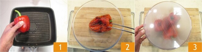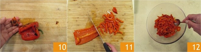 Nehmen Sie die inzwischen lauwarmen Paprika und schälen Sie sie 10. Öffnen Sie sie zur Hälfte und entfernen Sie sowohl die Samen als auch den Stiel. Dann schneiden Sie Streifen von etwa ½ cm 11. In eine Schüssel geben und mit Salz, Öl und Pfeffer würzen 12.