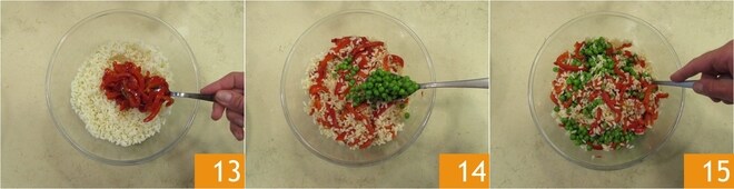 Fügen Sie dem Reis die gerösteten Paprika mit ihrem Dressing 13 und die Erbsen ohne Chilischote 14 hinzu. Alles gut mischen 15 und beiseite stellen, um den Geschmack ziehen zu lassen.