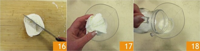 Nun zur Mozzarella-Creme übergehen. Schneiden Sie den Fiordilatte in Stücke 16 und geben Sie ihn in einen hohen, schmalen Behälter 17. Fügen Sie dann die Sahne hinzu 18 und pürieren Sie alles.