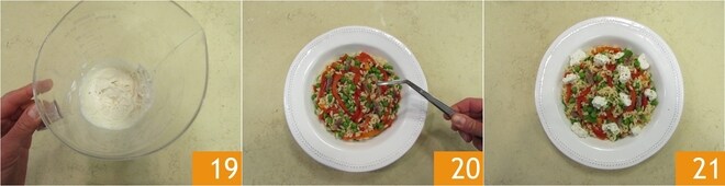 Sie sollten eine glatte und dichte Creme erhalten 19. Den lauwarmen Reis mit Paprika und Erbsen anrichten, die zerkleinerten Anchovis hinzufügen 20 und mit Mozzarella-Creme und frischen Minzblättern 21 dekorieren.