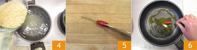 Sobald das Wasser zu kochen beginnt, den Reis hineingeben 4 und etwa 12 Minuten kochen. Dann gut abseihen und in eine große Schüssel zum Abkühlen geben. In der Zwischenzeit auch die Erbsen zubereiten. Schneiden Sie die Chilischote ein 5 und geben Sie sie in eine Pfanne mit einem Schuss Öl 6.