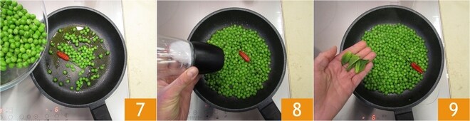 Lassen Sie es ein paar Minuten anbraten, dann die Erbsen hinzufügen 7. Salzen 8 und bei starker Hitze 5 Minuten kochen lassen 8. Fügen Sie dann die Minzblätter hinzu 9, schalten Sie die Hitze aus und stellen Sie es beiseite.