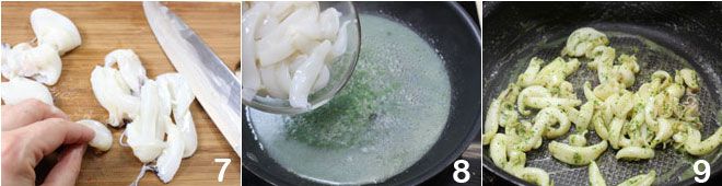 Reinigen Sie die Tintenfische, entfernen Sie die Tentakel und schneiden Sie den Körper in Streifen 7, dann kochen Sie sie in einer Pfanne zusammen mit der Venusmuschelsoße und der restlichen Petersilie 8, bis sie die Soße vollständig aufgenommen haben 9, das dauert etwa 10 Minuten.