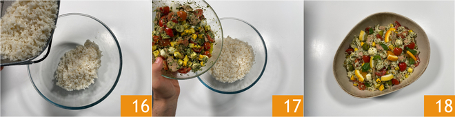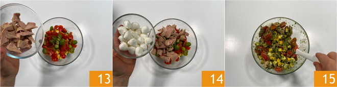 Fügen Sie auch die leicht zerbröckelten Thunfischfilets 13 und die kleinen Mozzarella-Kugeln 14 hinzu. Mischen Sie alles und lassen Sie es mindestens eine halbe Stunde im Kühlschrank ruhen 15. In der Zwischenzeit kochen Sie den Reis in gesalzenem, kochendem Wasser.