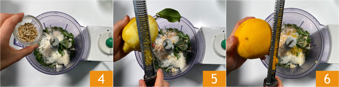 Geben Sie auch die Pinienkerne 4 und die abgeriebene Schale der Zitrone 5 und der Orange 6 dazu.