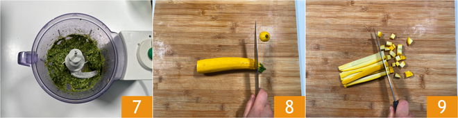 Mixen Sie in kurzen Intervallen, bis Sie eine cremige Konsistenz erhalten 7. Übertragen Sie das Pesto in eine große Schüssel und stellen Sie es beiseite. Für das Dressing: Entfernen Sie die Enden der gelben Zucchini 8 und schneiden Sie sie in 1 cm große Würfel 9.