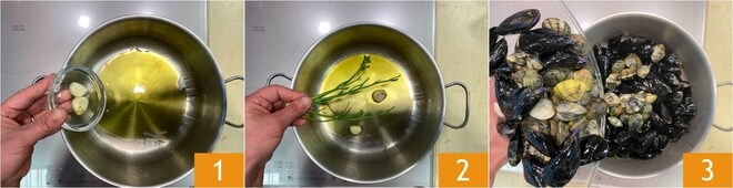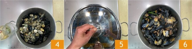 Löschen Sie mit Weißwein ab 4 und decken Sie mit einem Deckel ab 5. Lassen Sie es ein paar Minuten auf mittlerer bis hoher Flamme kochen, bis sie sich geöffnet haben 6.