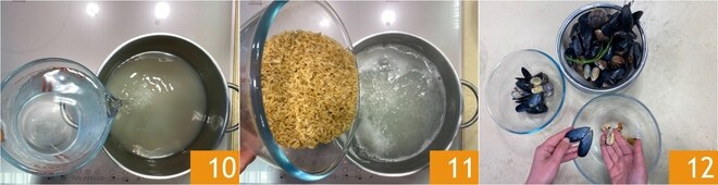 Gießen Sie die gefilterte Flüssigkeit in einen Topf, verdünnen Sie mit Wasser und bringen Sie sie ohne Salzzugabe zum Kochen. Sobald es kocht, kochen Sie den Vollkornreis 11 gemäß der Packungsanweisung. In der Zwischenzeit schälen Sie die Muscheln und Venusmuscheln 12, wobei Sie einige mit der Schale für die Dekoration der Teller aufbewahren.