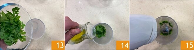Legen Sie die Petersilienblätter in ein hohes Glas 13, gießen Sie das Öl dazu 14. Mixen Sie, um ein cremiges Pesto zu erhalten 15.