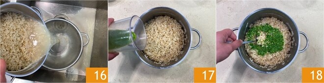 Nach dem Kochen, seihen Sie den Reis ab 16 und würzen Sie ihn mit dem Pesto 17, mischen Sie, um den Geschmack zu intensivieren 18.