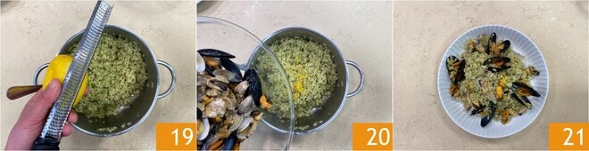 Würzen Sie mit Salz, Pfeffer und duften Sie mit Zitronenschale 19. Fügen Sie nun auch die Muscheln und Venusmuscheln hinzu und mischen Sie alles 20. Der Reissalat mit Petersilienpesto und Meeresfrüchten ist servierbereit 21.