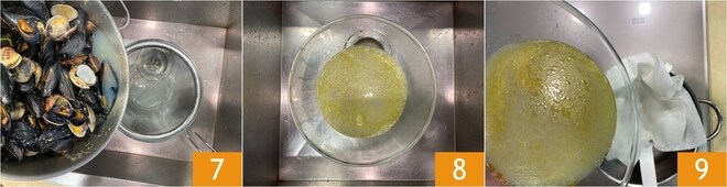 Seihen Sie die Meeresfrüchte ab 7 und behalten Sie deren Flüssigkeit 8. Filtern Sie diese mit einem Küchenpapier, um die Verunreinigungen zu entfernen 9.