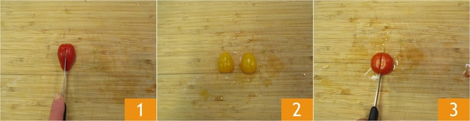 Um den Reissalat mit 4 Tomaten zuzubereiten, waschen Sie zuerst alle Tomaten gründlich. Halbieren Sie die roten Datteltomaten 1 und machen Sie dasselbe mit den gelben 2 und den Kirschtomaten 3.