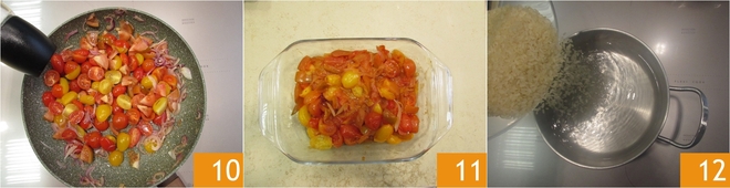 Würzen Sie mit Salz 10 und braten Sie die Tomaten etwa 5 Minuten an. Geben Sie sie in einen Behälter und stellen Sie sie beiseite 11. Kochen Sie den Reis in gesalzenem kochendem Wasser 1, gemäß der auf der Packung angegebenen Zeit.