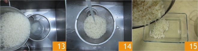 Wenn er gekocht ist, lassen Sie ihn abtropfen 13 und kühlen Sie ihn unter fließendem kaltem Wasser ab 14. Lassen Sie den Reis gut vom Wasser abtropfen und geben Sie ihn in eine Schüssel 15.