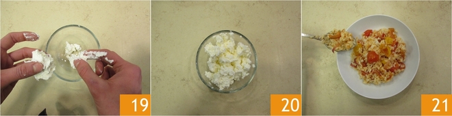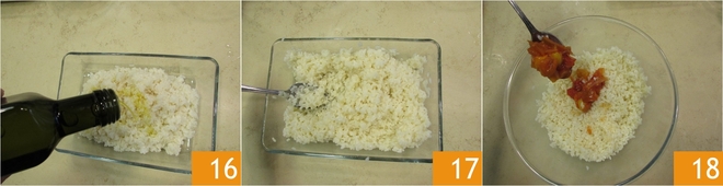 Fügen Sie einen Schuss Öl hinzu 16, mischen Sie 17 und lassen Sie ihn abkühlen. Geben Sie den Reis in eine große Schüssel, fügen Sie die inzwischen abgekühlten 4 Tomaten hinzu 18 und mischen Sie erneut.