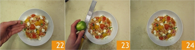 Fügen Sie die Stücke der Robiola, Oregano- und Basilikumblätter hinzu, die Sie mit den Händen zerkleinern 22. Beenden Sie mit etwas Limettenschale 23, einem Schuss Öl und servieren Sie Ihren Reissalat mit 4 Tomaten 24.
