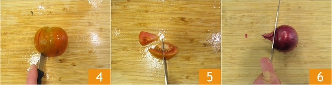 Nehmen Sie die Camone-Tomate, entfernen Sie den Stiel und halbieren Sie sie. Legen Sie die Tomate mit der Haut nach oben auf das Schneidebrett und schneiden Sie sie in 1,5 cm dicke Spalten 4. Schneiden Sie jedes Spaltstück, um 3 gleiche Dreiecke zu erhalten 5. Nehmen Sie jetzt die Zwiebel und schälen Sie sie 6.
