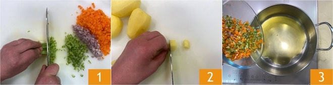 Um die Reissuppe mit Hülsenfrüchten zuzubereiten, wascht und schneidet das Gemüse für das Soffritto in Brunoise, d.h. Sellerie, Karotte und Zwiebel 1. Schält die Kartoffeln und schneidet sie in Würfel von etwa 2 cm 2. Gebt das Öl und das gehackte Soffritto in einen Topf 3.