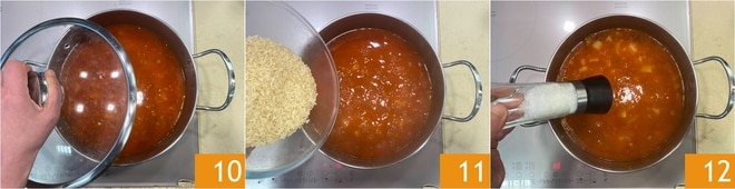 Bedeckt mit einem Deckel 10 und lasst es 20 Minuten bei mittlerer Hitze köcheln. Nach der Garzeit den Reis dazugeben 11 und umrühren, dann mit Salz abschmecken 12. Bedeckt mit dem Deckel und lasst es weitere 10 Minuten auf dem Herd, dabei gelegentlich umrühren.