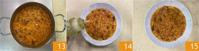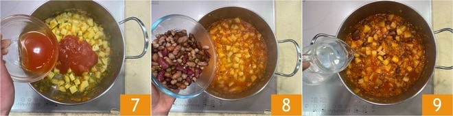 Gebt auch die Tomatenpassata 7 und die Hülsenfrüchte dazu 8. Kocht ein paar Minuten lang, dann gebt das Wasser dazu 9.