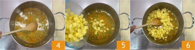 Schmort etwa 10 Minuten lang bei niedriger Hitze 4, dann fügt die Kartoffeln hinzu 5 und rührt um 6.