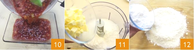 Wenn die Rhabarberkonfitüre fertig ist, geben Sie sie in eine Schüssel, um sie abkühlen zu lassen 10. In der Zwischenzeit kümmern Sie sich um den Mürbeteig: Geben Sie im Mixer das Mehl und die kalte Butter aus dem Kühlschrank, in Stücke geschnitten 11. Mixen Sie alles, bis Sie eine sandige Konsistenz erhalten, dann geben Sie die Mischung auf die Arbeitsfläche, formen Sie eine klassische Fontaineform und fügen Sie den Puderzucker hinzu 12.