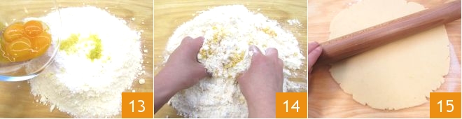 Fügen Sie auch die geriebene Zitronenschale und die Eigelbe hinzu 13, und kneten Sie kurz 14, gerade so viel, um den Teig kompakt zu machen. Formen Sie einen Laib, wickeln Sie ihn in Frischhaltefolie ein und lassen Sie ihn 30 Minuten im Kühlschrank ruhen. Nach der erforderlichen Zeit rollen Sie den Teig mit einem Nudelholz auf etwa 1 cm Dicke aus 15.