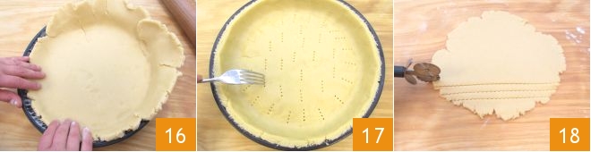 Mit dem Nudelholz legen Sie ihn in die eingefettete und bemehlte 25 cm große Kuchenform, drücken Sie ihn leicht mit den Fingern in den Boden und an die Ränder 16. Schneiden Sie den überschüssigen Teig mit einem kleinen Messer ab, bewahren Sie ihn auf, und stechen Sie den Boden der Torte mit einer Gabel ein 17. Kneten Sie den überschüssigen Teig erneut und rollen Sie ihn wieder aus, um mit einem Teigschneider Streifen 18 herauszuschneiden, die Sie zur Dekoration verwenden.