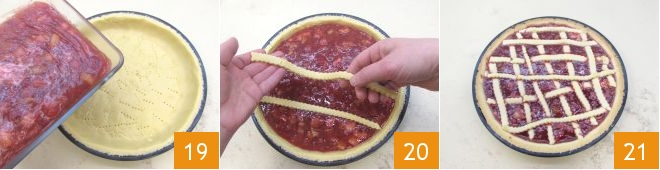 Gießen Sie die Erdbeer-Rhabarber-Konfitüre in den Mürbeteigboden 19 und vervollständigen Sie die Torte, indem Sie die Teigstreifen auf der Oberfläche anordnen 20, um Rauten zu bilden. Backen Sie in einem vorgeheizten statischen Ofen bei 180° für 40 Minuten (oder bei 160° für 30 Minuten im Umluftofen), dann nehmen Sie Ihre Rhabarbertorte aus dem Ofen 21 und lassen Sie sie abkühlen, bevor Sie sie aus der Form nehmen!