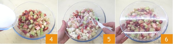 fügen Sie den Zucker hinzu 4 und mischen Sie gut 5, dann decken Sie die Schüssel mit Frischhaltefolie ab 6 und lassen Sie sie 2-3 Stunden ruhen, damit der Rhabarber seinen Saft abgeben kann.