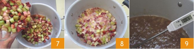 Nach der erforderlichen Zeit geben Sie die Erdbeeren und den Rhabarber in einen Topf 7 und kochen Sie sie 10 Minuten bei mittlerer Hitze, dann weitere 50-60 Minuten bei niedriger Hitze. Lassen Sie nun die Kartoffelstärke in der Konfitüre auflösen 8 und lassen Sie die Mischung auf dem Feuer, bis sie 108° erreicht (die Temperatur können Sie mit einem Küchenthermometer überprüfen) 9.