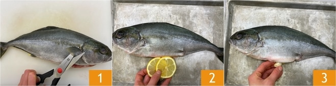 Um den im Ofen gebackenen Gelbschwanz zuzubereiten, nehmen Sie zuerst den bereits ausgenommenen Fisch und schneiden Sie die Flossen ab 1. Falls Sie einen nicht ausgenommenen Fisch gekauft haben, können Sie unsere Anleitung "Wie man die Stachelmakrele reinigt" konsultieren. Legen Sie die Zitronenscheiben 2 und die geschälte Knoblauchzehe in den Bauch des Gelbschwanzes 3.