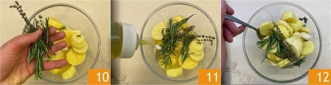 Fügen Sie auch die Thymian- und Rosmarinzweige hinzu 10, würzen Sie dann mit Öl 11, Salz und Pfeffer. Gut vermischen 12.