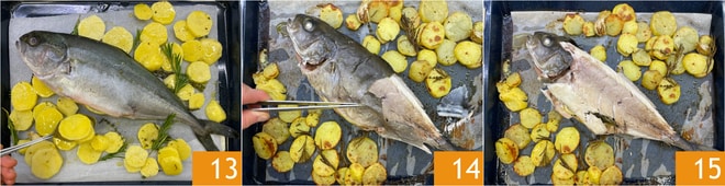 Verteilen Sie die Kartoffeln rund um den Gelbschwanz 13, und backen Sie dann im vorgeheizten statischen Ofen bei 200 °C für etwa 25-30 Minuten. Um die Garzeit zu überprüfen, können Sie die Zinken einer Gabel in den fleischigsten Teil des Fisches stechen: Das Fleisch sollte undurchsichtig sein und sich leicht zerteilen lassen. Nach der Garzeit aus dem Ofen nehmen und einige Minuten ruhen lassen, danach können Sie die Haut entfernen 14. Sobald die Haut entfernt ist, filetieren Sie den Fisch 15.