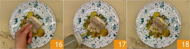 Servieren Sie die Gelbschwanzfilets auf einem Bett aus Kartoffeln, garnieren Sie dann mit frischen Thymianblättern 16, frisch gemahlenem Pfeffer und einem Schuss Rohöl 17. Ihr im Ofen gebackener Gelbschwanz ist bereit zum Servieren 18!