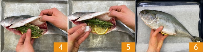 Fügen Sie auch die Thymian- und Rosmarinzweige hinzu 4, salzen Sie dann das Innere 5 und legen Sie den Fisch auf ein mit Backpapier ausgelegtes Blech 6.