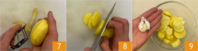 Kümmern Sie sich um die Kartoffeln: schälen Sie sie 7 und schneiden Sie sie in etwa 1 cm dicke Scheiben 8. Geben Sie die Kartoffeln in eine Schüssel und fügen Sie die zerdrückte Knoblauchzehe hinzu 9.