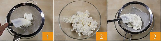 Um das Ricotta-Eis zuzubereiten, beginnen Sie genau mit dem Ricotta. Stellen Sie den Ricotta in den Kühlschrank, um ihn in einem feinmaschigen Sieb mit einer Schale darunter abtropfen zu lassen, und decken Sie ihn mit Frischhaltefolie ab. Sie können dies am Abend zuvor oder ein paar Stunden vor der Zubereitung tun, um dem Ricotta die überschüssige Molke zu entziehen. Dann sieben Sie den Ricotta mit einem Sieb und einer Spatel 1 oder mit der Rückseite eines Löffels und sammeln Sie ihn in einer kleinen Schale 2. Wiederholen Sie den Vorgang mindestens 3 Mal, indem Sie den Ricotta mit der Spatel und dem Sieb sieben, um ihn cremiger zu machen 3. Sobald der Ricotta gesiebt ist, stellen Sie ihn beiseite.
