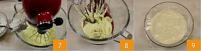 Jetzt nehmen Sie den gesiebten Ricotta und fügen ihn der Creme hinzu 7; schlagen Sie noch ein paar Minuten weiter, um ein cremiges Ergebnis zu erzielen 8. Jetzt, da der Teig fertig ist, geben Sie ihn in eine Schüssel und bedecken Sie sie mit Frischhaltefolie 9. Stellen Sie die Schüssel für mindestens 4 Stunden in den Kühlschrank, damit das Eis fest wird. Für eine körnigere und festere Konsistenz können Sie die Eigelbe und den Zucker mit dem Mixer schlagen und den Ricotta und das gewählte Aroma von Hand mit einem Spatel unterheben.