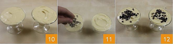 Nach der erforderlichen Zeit nehmen Sie die Schüssel aus dem Kühlschrank und geben das Eis in die Schalen 10 mit einem Teelöffel oder mit einem Spritzbeutel mit glatter Tülle. Sie können Ihr Ricotta-Eis mit Schokoladentropfen oder -splitt (11-12) garnieren, oder Sie können es je nach Geschmack Ihrer Gäste garnieren: mit Haselnusskrokant, ganzen oder gehackten Keksen, Minzblättern oder es mit frischem Obst begleiten! Alternativ, für eine "Halbgefroren"-Konsistenz, können Sie einen körnigeren und cremigeren Teig wie in der zweiten Folge erstellen: Legen Sie mit angefeuchtetem Backpapier Förmchen aus, füllen Sie sie mit der erhaltenen Creme und stellen Sie sie in den Kühlschrank, bedeckt mit Frischhaltefolie, damit sie fest werden. Nach der erforderlichen Zeit stürzen Sie sie, indem Sie sie auf Desserttellern umdrehen!