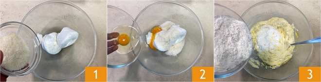Um die Ricotta-Gnocchi mit Erbsen, Pecorino und Guanciale zuzubereiten, geben Sie den Ricotta, den geriebenen Käse 11 und die Eier 2 in eine Schüssel. Mischen Sie mit einem Löffel, um eine glatte Creme zu erhalten, und fügen Sie dann das Mehl 3 hinzu.