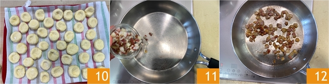 Legen Sie die Gnocchi, sobald sie geformt sind, mit ausreichend Abstand auf ein mit einem bemehlten Küchentuch ausgelegtes Tablett 10. Beschäftigen Sie sich mit der Zubereitung des Dressings: Schneiden Sie den Guanciale in 1 cm große Würfel und geben Sie ihn in eine bereits heiße Pfanne 11. Braten Sie ihn etwa 5 Minuten oder bis er knusprig und goldbraun ist 12.