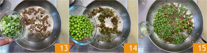 Fügen Sie die fein gehackte Frühlingszwiebel hinzu 13 und lassen Sie sie ein paar Minuten anschwitzen, dann geben Sie die Erbsen hinzu 14 und sautieren sie weitere 2 Minuten. Löschen Sie mit dem Weißwein ab 15 und lassen Sie ihn vollständig verdampfen.