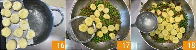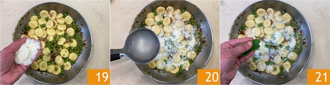 Kochen Sie die Gnocchi in reichlich kochendem Salzwasser 16 und sobald sie an die Oberfläche kommen, schöpfen Sie sie direkt in die Pfanne mit dem Dressing 17 und fügen Sie eine Kelle Gnocchi-Kochwasser hinzu 18.