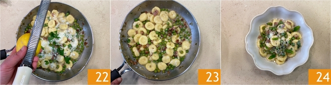 Vervollständigen Sie mit geriebener Zitronenschale 22 und Pfeffer nach Geschmack. Mischen Sie 23 und servieren Sie sofort Ihre Ricotta-Gnocchi mit Erbsen, Pecorino und Guanciale 24!